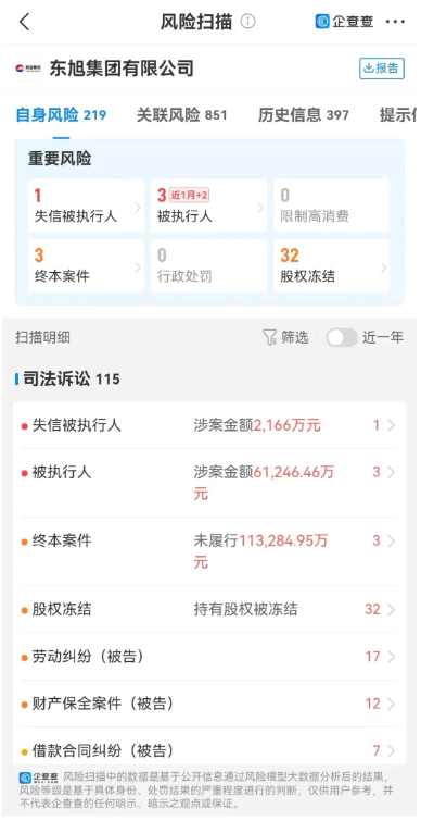 金鹰基金的第一大股东——东旭集团,目前处于财务危机的状态,公开信息给了它明确的标签:失信被执行人、被执行人、股权冻结。